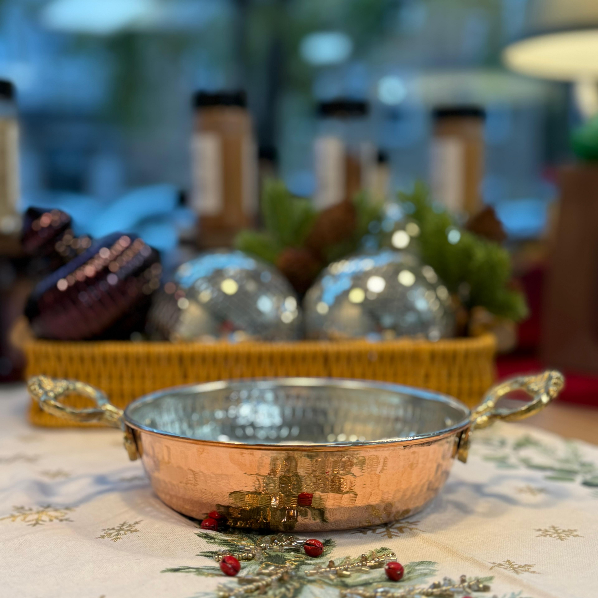 Perfect for frying eggs or preparing small portions, the 16cm Solid Copper Yumurta Sahanı (No:2) is a must-have for traditional cooking lovers. Handmade from 100% pure copper and lined with food-safe tin, this compact pan delivers excellent heat distribution and an authentic culinary experience.