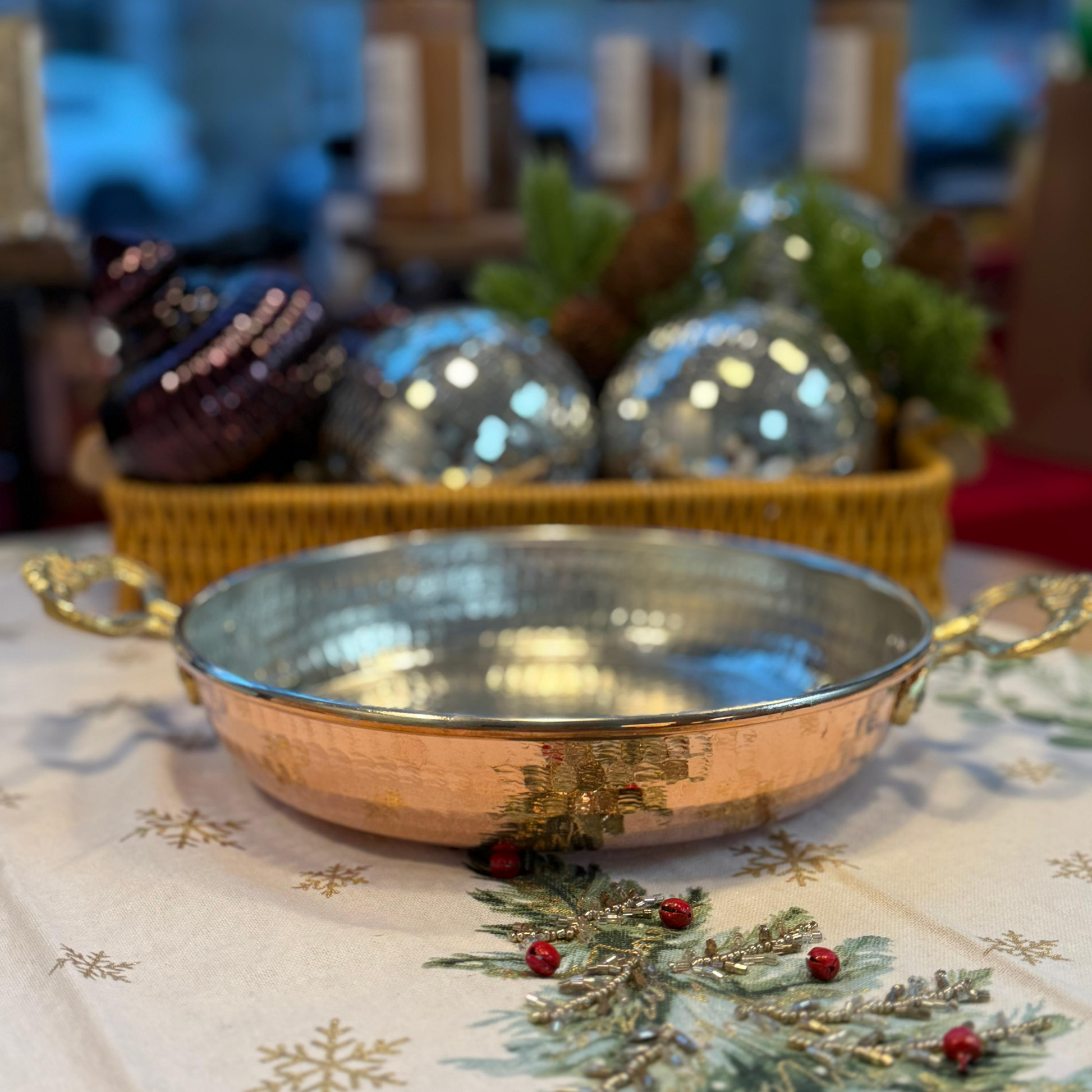 Whether you're frying eggs, heating meze, or preparing a side dish, this pan delivers superior heat conductivity, a food-safe tin lining, and a beautiful hammered finish that goes from stovetop to table with style.